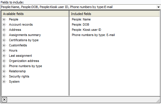 Open up Fields to include. Use the plus sign to open the categories of fields, then scroll through the list of pipelines, and the fields in them, on the left (Available fields). Drag the fields you want to the right (Included fields). Each field will become a column on the report. Re-arrange fields by dragging them up or down on the list. Remove a field by dragging it back over to the left section.