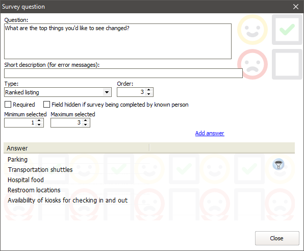 A ranked listing question lets the survey recipient choose zero or more items from the list, and assigns an order (ranking) to each. In the example below, the recipient must choose at least one answer and can choose up to three.