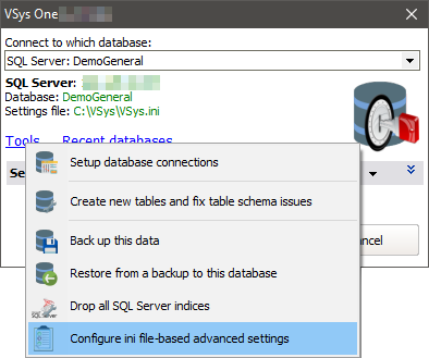 Some VSys settings are available before you're all of the way into VSys One itself and before you've connected to the database. Generally these are advanced settings. Get to them from the database selection screen (below). If VSys automatically connects to its database at startup, hold down the left Ctrl key on your keyboard while starting VSys.