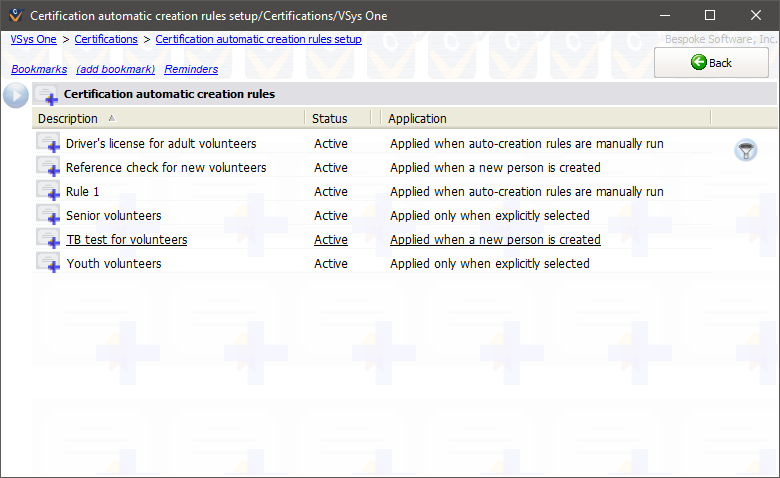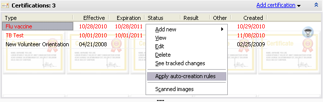 These rules only apply when you're creating a new person (and Automatically apply this rule when creating a new person manually is checked) or when you right-click on a person's list of certifications. Changing someone's status, changing or creating these rules, and other actions will not cause VSys to create new certifications based on these rules.