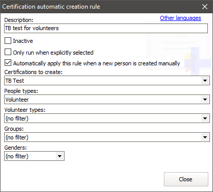 This rule will be applied immediately when a new person is manually created who is a "Volunteer", creating a new "TB Test" certification for them in their profile.