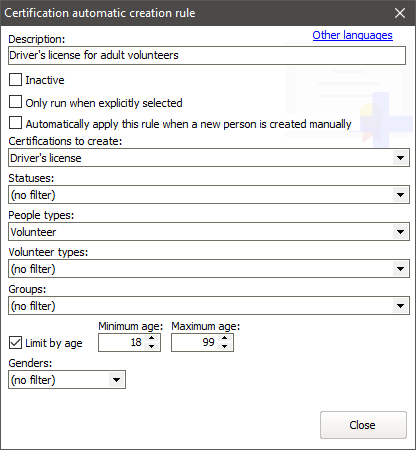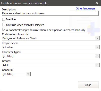 Like the example above, this will automatically create a "Background reference check" certification for any new person created as a "Volunteer", but only if they're in the group "Adult".