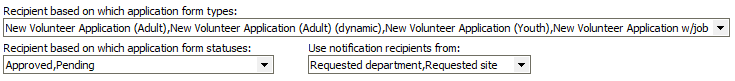 VSys will look at the Requested site and/or Requested department from recent applications submitted by the person referenced in the application in order to find the right people to notify. You can filter on the application type and statuses, then which properties VSys should use to find the recipient(s). In this example, VSys will look at both the Requested department and Requested site of recent applications with a Status of Approved or Pending. If a person has two or more applications which meet your criteria, VSys will use only the most recent one. An application that's more recent but doesn't meet your filters on application type and status is ignored; VSys will continue to look at older applications until it finds one that matches your filters. After finding a matching application, VSys will get the recipients from the Send notification e-mails to field and the Relationships from both the Requested department and Requested site. If the referenced person doesn't have any recent applications, or none that meet your criteria, no notifications will be sent. |