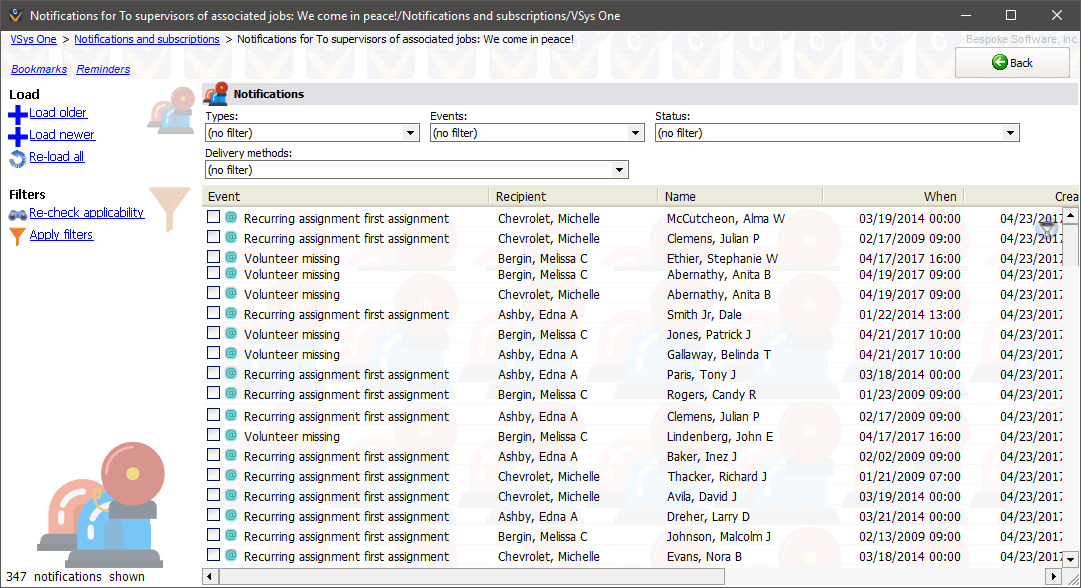 By default, VSys doesn't show older notifications here. Click on the Load older link to display older ones. Clicking on Re-check availability checks the notifications to see if they've become obsolete, and any which are get crossed out.