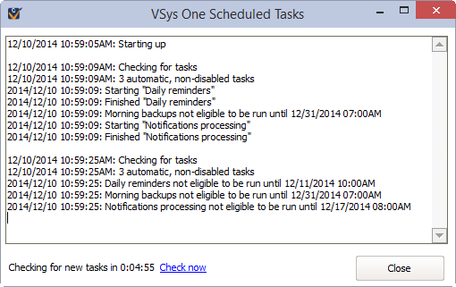 Note that when running from the Administrator tools panel that while VSys is running, it's inaccessible. That's important since the task groups that VSys is running would interfere with your normal usage of VSys. Nothing prevents you from launching a second copy of VSys on the same machine that you use for your regular tasks, of course.