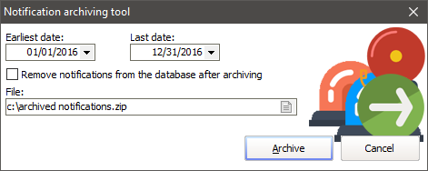 From the Notifications subscriptions tool, click on Archive notifications. Select a date range of notifications to be archived, select a File and click Run. (To have VSys actually remove the notifications from its database, check Remove notifications... first.)