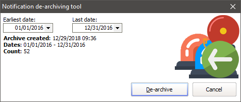 From the Notifications subscriptions tool, click on De-archive notifications, then the name of the archive file. You can limit the date range for notifications brought back in, then Run. If the archive file contains notifications that are already in VSys, VSys won't overwrite the existing notification, so when it tells you how many notifications were restored, that number could be less than the number you expect, even zero.