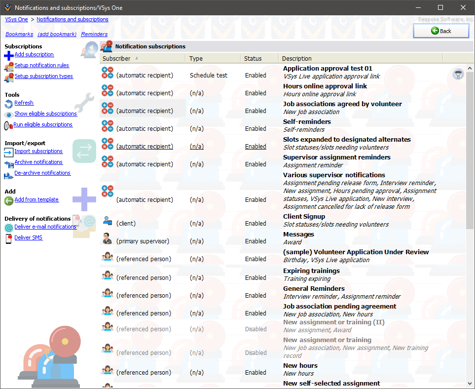 Prompts you to select a person in VSys, then creates a subscription for that individual. |