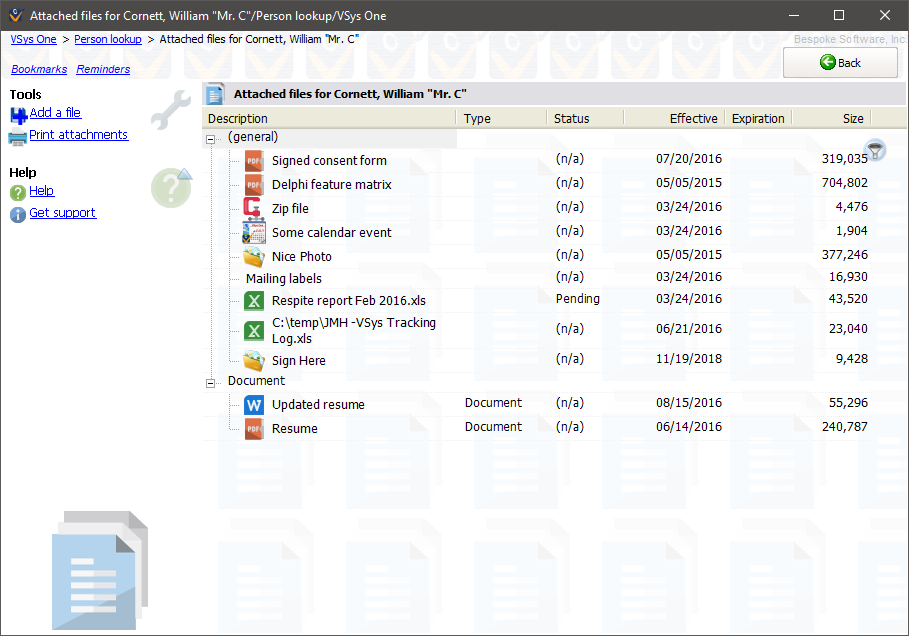 VSys One lets you attach files to people and jobs. Why? Use this to take PDF files, resumes, pictures and other documents from your computer's hard drive and link them to a person (or job, etc.) for later use. Once the file is attached, then VSys doesn't need the one on your computer anymore, and that attachment is accessible to people who can't see your computer but who can use VSys One.