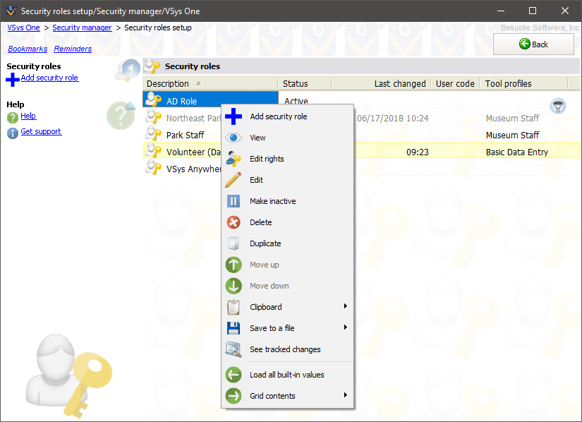 Security roles define sets of access rights that can be then inherited by individual users. For example you can define the role "Data entry" and give that role access to certain tools.