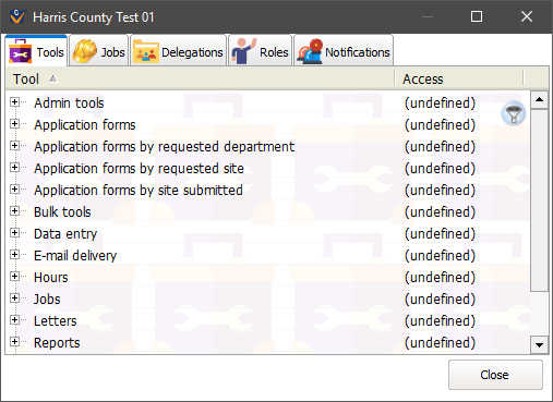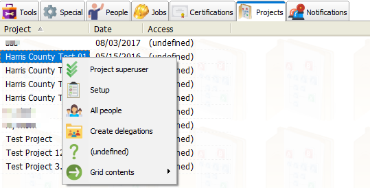 Clicking on a project brings up details for that project which permit access to tools, jobs, people via delegation and people via role. (Tool rights here do not inherit from rights to the equivalent global tool.)