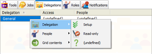 Within an individual project, the ability to edit or add people within a delegation is defined here. A user has two different sets of rights to a delegation: "Access" which defines whether or not the user can change the delegation's setup, plus "People" which lets him add, edit or delete people within the delegation.