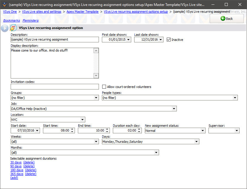 Defining VSys Live recurring assignments gives volunteers the opportunity to sign up online for these jobs. The rules you assign here are used to generate real recurring assignments for the volunteers who select them.