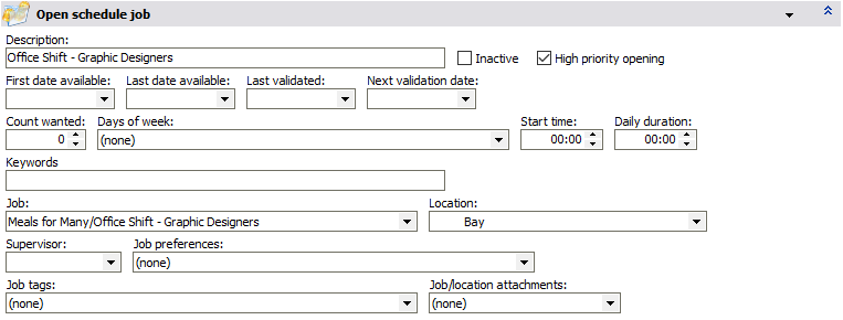 Note that open schedule jobs aren't capacity controlled, meaning that VSys Live has no idea when you have enough people for one to be filled. That means that you have to go in and mark the open schedule job as Inactive when you've recruited enough people and want it to no longer be available for online signup.