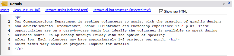 In merge templates, what value should be used as the open schedule job's detailed description? That can be "(use details here)" which is the Details HTML below or it can be one of the "User text ..." fields from the job itself. If a User text field is chosen here and that field is blank, VSys Live will fall back to and use the Details below. |