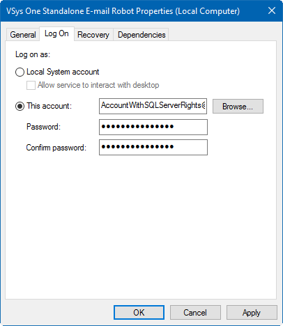 If your database connection is set to use domain authentication, the Standalone E-mail Robot service must start as a user with rights to that SQL Server database. If your SMTP server requires domain authentication then the account used to start the service must also have rights on your SMTP server for relay.