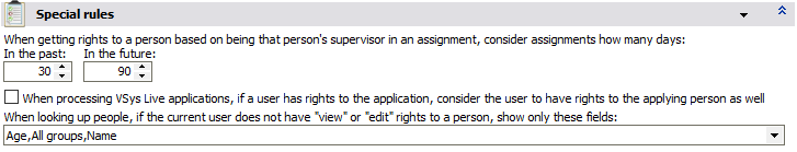 These options are used when VSys Security is in advanced mode and VSys is looking to determine if, for a particular person, the current user is a supervisor of that person. They determine how far into the past and future VSys will look for assignments in which the current user is the supervisor for an assignment with this person as the volunteer. Setting both of these to 0 prevents assignment-based supervisors from being considered here.