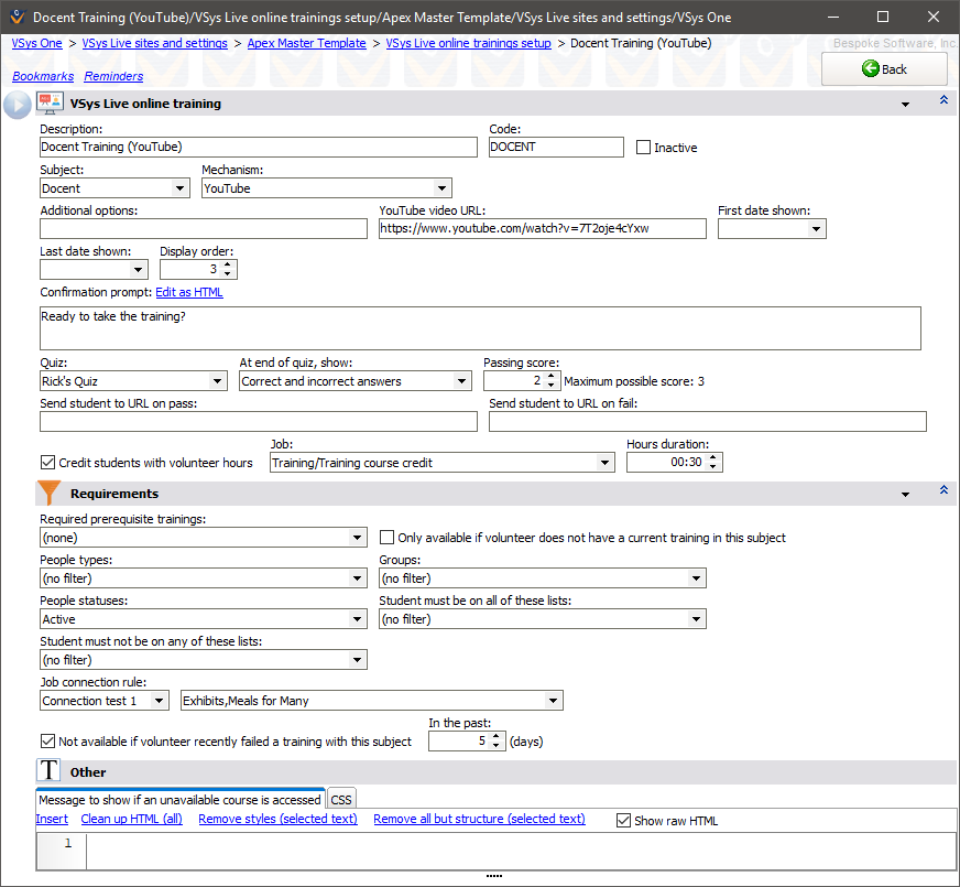 Optional; if this training is linked via a VSys Live menu and you've put a text value here, VSys Live will use that instead of the (ugly) internal ID code for the course. |
