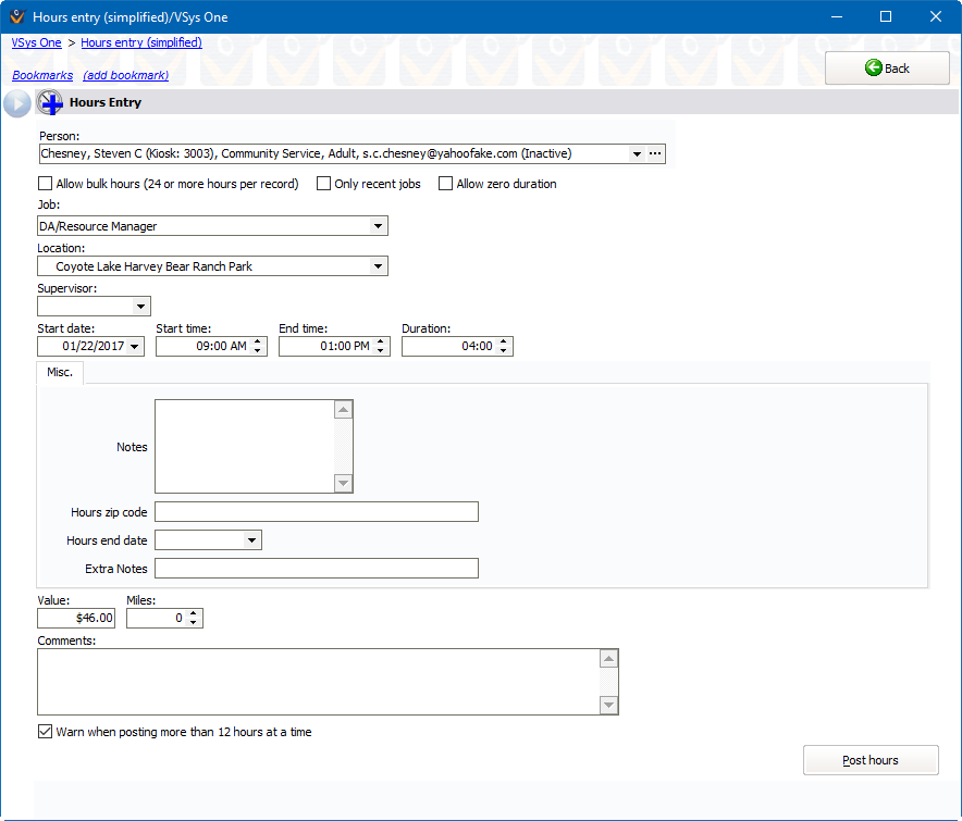 The monetary value of the volunteer hours. VSys automatically calculates this based on the length of the assignment and the job, but you can override its value here.