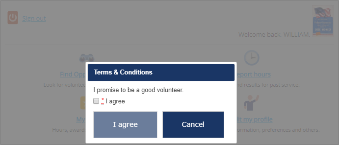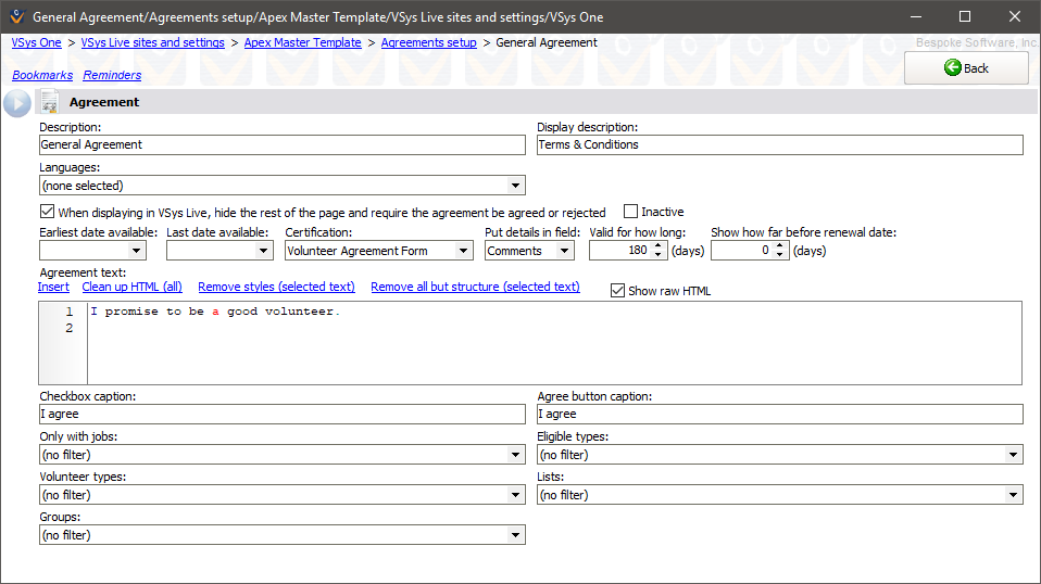 Agreements in VSys Live are formal bits of text displayed to volunteers to which those volunteers must indicate agreement. Common uses for these would be to confirm acceptance of policy statements, privacy regulations, or documents dictated by your legal or risk management departments.