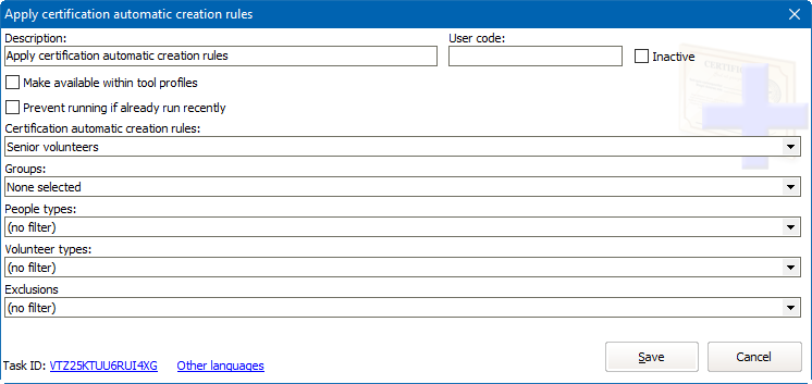 Select one or more certification automatic creation rules, and enter any filters on Groups, People types, Volunteer types and Exclusions (these filters are performed in addition to any rules defined in the certification automatic creation rule itself). When run, this task will apply these creation rules and generate a report of all people that were affected.