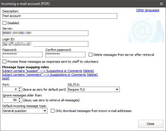 VSys can automatically retrieve incoming e-mails from your volunteers by querying your mail server, then produce incoming messages based on those e-mails. Each incoming e-mail setting is used to retrieve mail from a single account on a single mail server. You can use multiple incoming e-mail settings to have VSys retrieve mail from multiple accounts on multiple servers. Each setting also includes a filter mechanism so that you can classify messages by subject and/or recipient e-mail address.