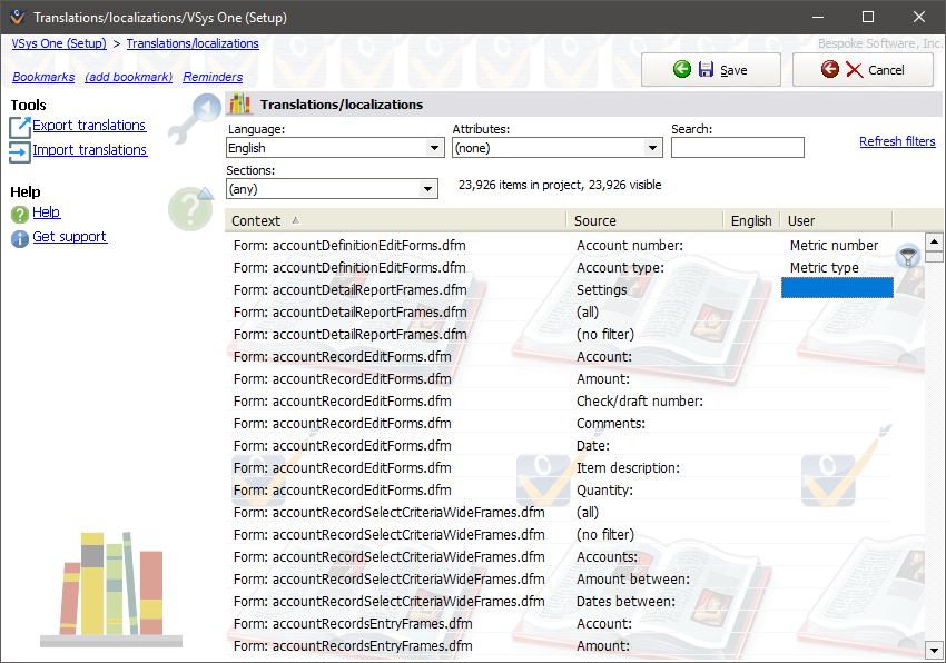 The Translations tool gives you a mechanism for changing the texts which are embedded throughout VSys One.