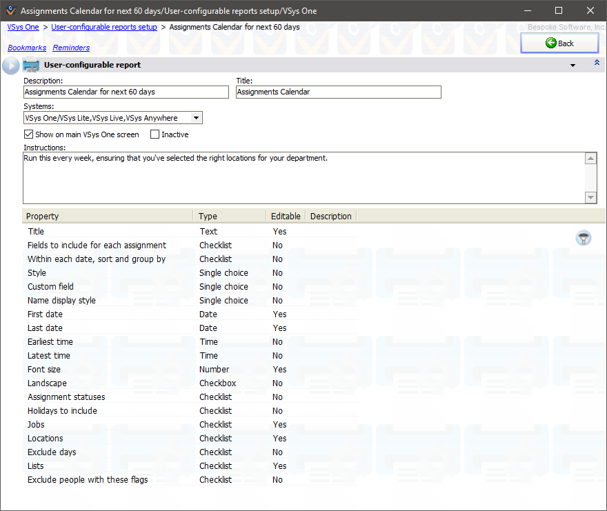 If checked, this report will show on the User-configurable reports panel on the main VSys One screen. |