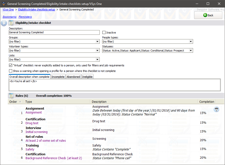 Only people who meet all of these criteria can have one of these checklists. (Use one or more Intellilists if you want to apply complex criteria to the applicability of these checklists to people.) |