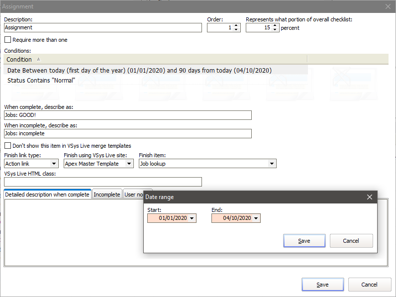 Don't show this item in VSys Live merge templates, Finish..., URL to finish, Detailed description when complete, Incomplete |