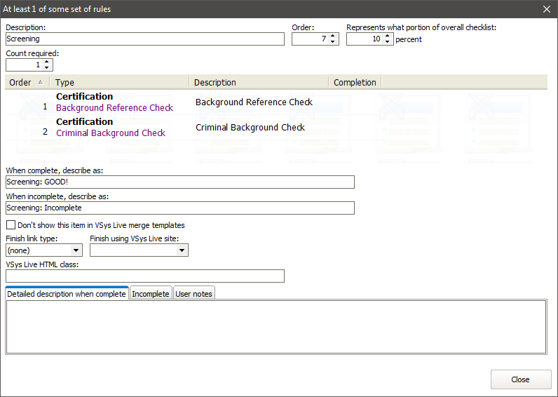 Used in VSys Live; all rules which have been met are added together to show the overall percentage status of the eligibility checklist. |