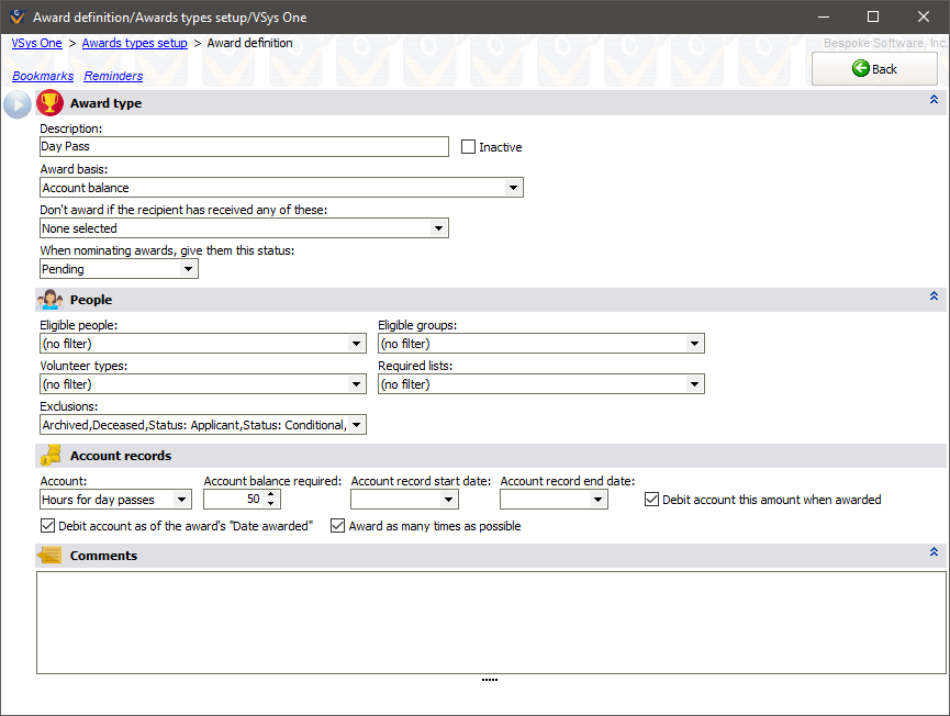 If a volunteer is eligible for more than one of these awards, VSys will generate as many awards as possible given the account's balance and the award's rules. For example a volunteer having an account balance of 174 with the award definition above would get three awards and three debits, bringing his balance down to 24. |