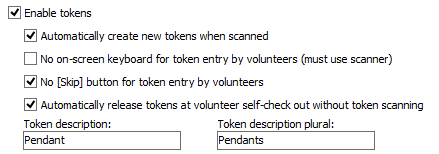 Checking this prevents the volunteer from finishing her check in process until she's entered or scanned a token. Un-checked she'll have a Skip button at that stage.