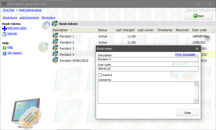 Use the Add kiosk token link to add a new token, or Refresh (only available if no changes have been made here) to have VSys reload the list of tokens and their current statuses.