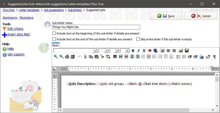 From here add fields and text as appropriate by using the Insert data field link. When embedded in a letter template, each suggested job opening that meets your criteria will be merged with these fields to produce the sub-letter's contents.