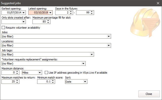 VSys can include as suggested jobs those slots which are "full" but for which there is a volunteer whose assignment status is "Volunteer requests replacement". Use this filter to control if VSys should include those job slots here, suppress them, or show only them. |