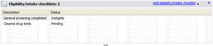 These represent eligibility/intake checklists for this person. Right-click on the list to Add a specific eligibility checklist, Delete a checklist, or Add all eligible checklists. Note that "virtual" eligibility checklists cannot be added to a person, they're only used as filters, created and destroyed as needed but never stored.