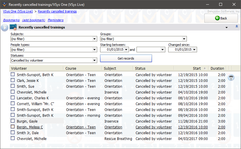 You may need a quick way to see what trainings have been cancelled, especially if you allow you volunteers to cancel their own trainings.