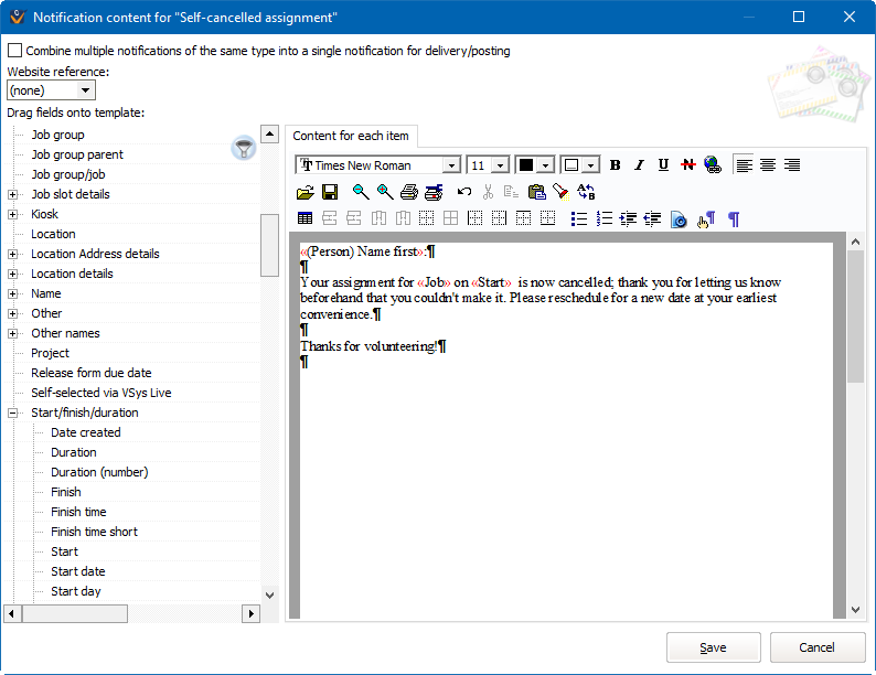 Certain notifications such as "Slots needing volunteers" can include special website URLs that are specific to the notification, in this case a link to the job opening in VSys Live. Selecting "VSys Live site" here will tell VSys to include a URL which points to this job opening. If you have more than one VSys Live site, you'll have to pick which site you want referenced.