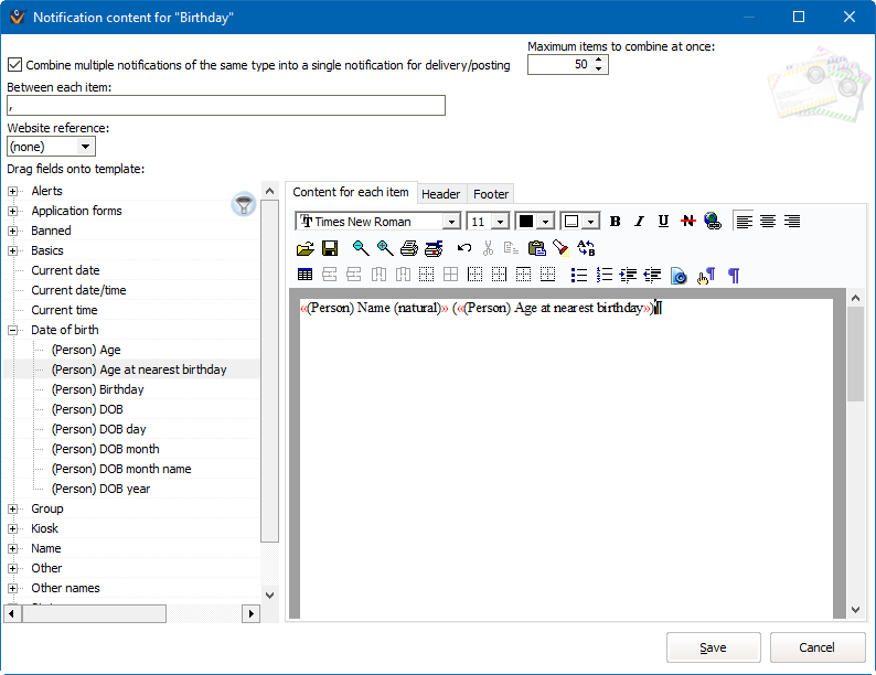 In some cases, notifications can be combined together on delivery. Checking Combine multiple notifications... tells VSys to combine them if possible and lets you define how you want them to go together.