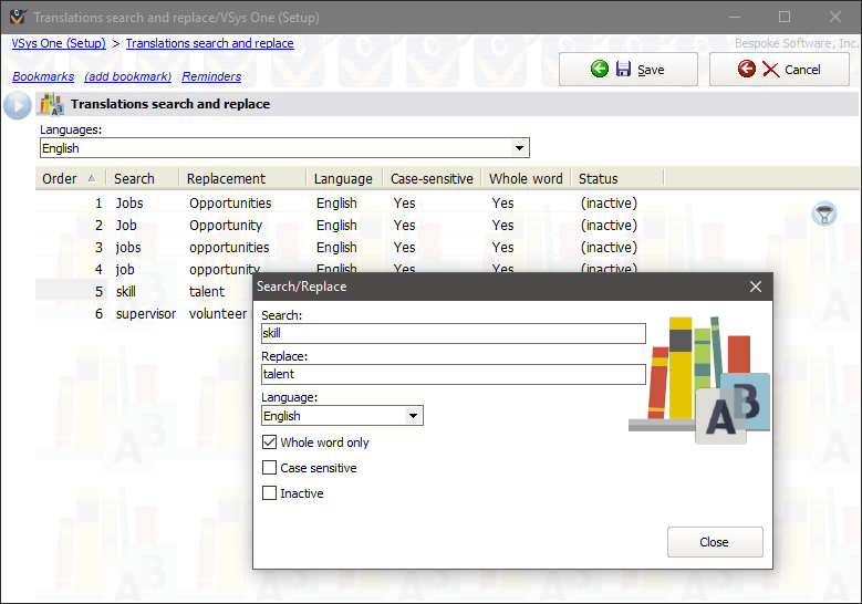 Translations search and replace is used to change how text values ("strings") are shown in VSys. Unlike the Translations tool, these changes are made to strings at the very last minute and are applied after translations have been applied.