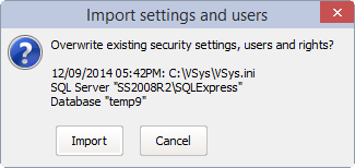 In version 3.0 of VSys One, the VSys Security configuration (settings, default rights, roles and users) can be exported to a file and then imported into another VSys database. In the process, VSys: