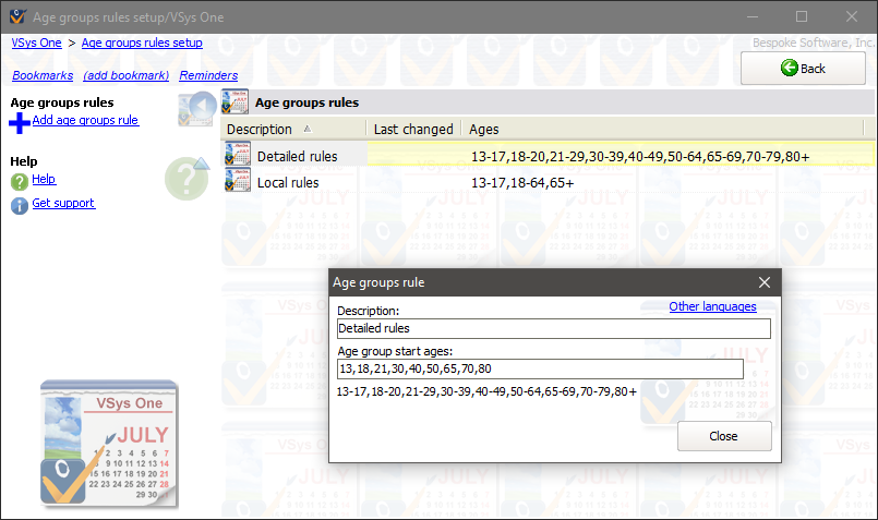 To summarize volunteers by age ranges rather than by specific ages, you can define one or more age group rules. For each age group rule you create, VSys will include a reportable field for people "Age group (xyz)", where "xyz" is the name of the age group rule. In the example below we've defined two age group rules. For each rule, define the age groups by entering the list of starting ages separated by commas. For the field "Age group (Detailed rules)", a volunteer who's 21 will have the value "21-29", where that same volunteer would have "18-64" in the field "Age group (Local rules)".