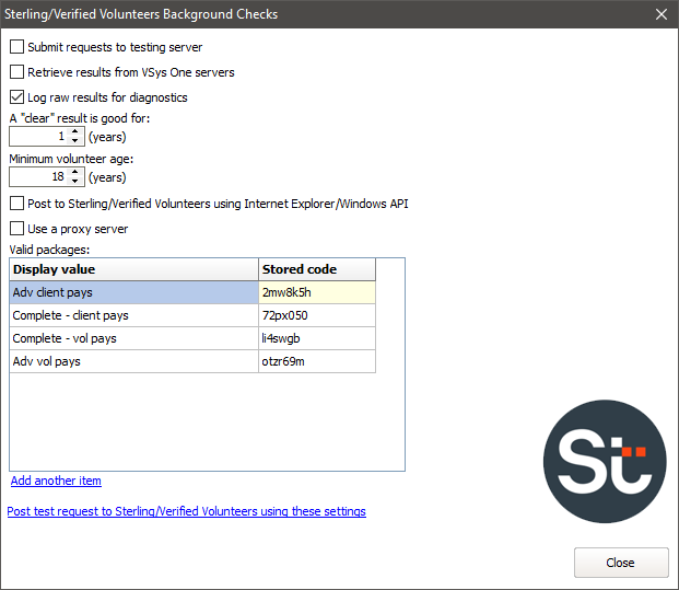If checked, VSys will send request submissions to Sterling Volunteers' testing server rather than production server. Note that the login credentials for the two servers will be different, as will the valid packages. |