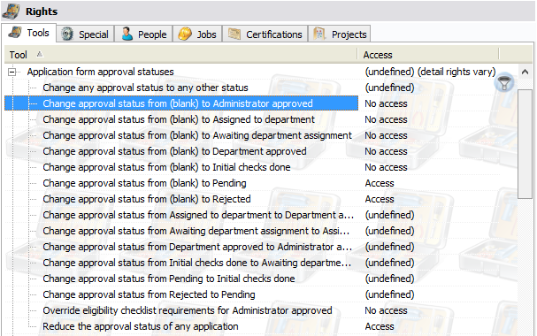 Within each user's security rights, on the Tools tab, you'll see the grouping "Application approval form statuses". Listed here are: