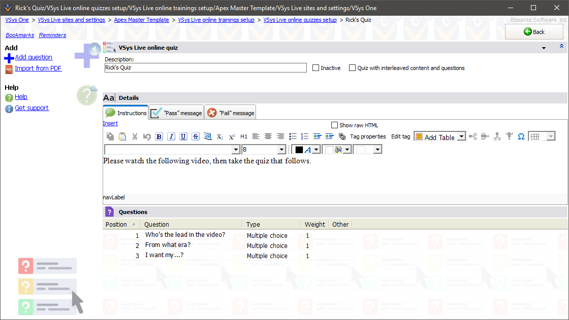 Right-click in the list of questions to add, edit or delete a question, or to change their order.