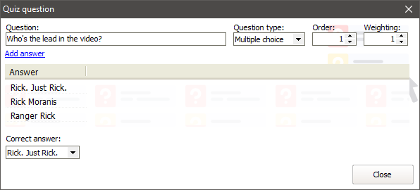 Weighting can be used to make some questions more important than others. When VSys Live calculates a person's score for the quiz, it adds together the weightings of all of the correctly-answered questions. For example,