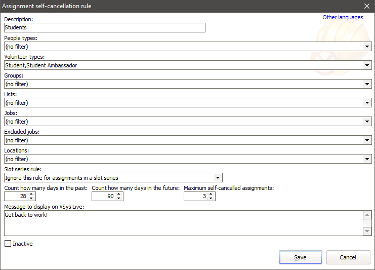 If a person meets the criteria of the rule (People types, Volunteer types, Groups, Lists), VSys Live counts the number of assignments for this person with the status of "Cancelled by volunteer" or "Volunteer requests replacement" based on the Count... fields here. If the volunteer has at least the Maximum self-cancelled assignments within that window, VSys Live will show your Message... rather than letting the volunteer cancel the assignment.