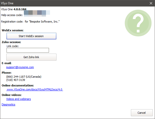 On most screens in VSys One or VSys Lite, you'll see the link Get support under Help on the left side. Clicking that will bring up: