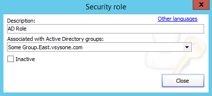 In the example below, making an Active Directory user a member of the group "VSys One administrators.vsysone.com" would give that user the VSys Security role "Administrator" at login.